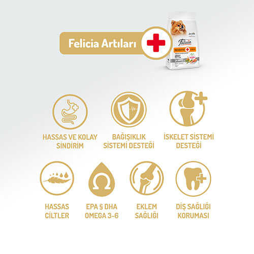 - Küçük ırk köpekler eklem problemlerine yatkın oldukları için, Felicia Mini Adult Salmon, yüksek oranda glukozamin ve kondroitin ile zenginleştirilmiştir.