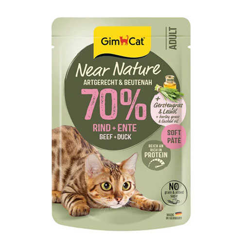 GimCat Near Nature Ezme Sığır Etli ve Ördekli Pouch Yetişkin Kedi Konservesi 85 Gr, kedilerin doğal avlanma içgüdülerine uygun şekilde geliştirilmiş, yüksek proteinli ve besleyici bir tam yaş kedi mamasıdır. Near Nature serisi, doğadan ilham alan içeriğiyle yetişkin kedilerin günlük besin ihtiyaçlarını dengeli biçimde karşılamayı hedefler.