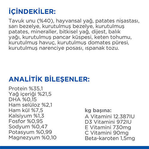 Böylece yaşam için en iyi başlangıcı elde eden kediler tüm potansiyellerini kullanarak büyürler.1 numaralı malzeme olarak tavuk kullanılmıştır.