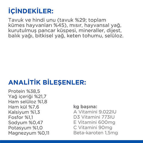 İÇİNDEKİLER: Tavuk ve hindi unu (tavuk 29%; toplam kümes hayvanları 45%), mısır, hayvansal yağ, kurutulmuş pancar küspesi, mineraller, hidrolize protein, balık yağı, bitkisel yağ, keten tohumu, selüloz.