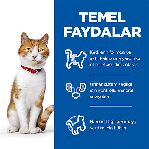 - Kilo Kontrolü ve Yağ Yakımı: Hills SCIENCE PLAN, kısırlaştırılmış kedilerin sağlıklı bir kiloyu koruyabilmesi için özel olarak geliştirilmiştir. WMF kilo kontrolü formülü, yağ yakımını desteklerken kas oluşumunu da teşvik eder.