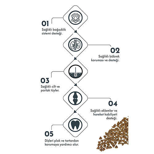 Yaban mersini tozu ve deniz yosunu gibi doğal antioksidan kaynakları, bağışıklık sistemini güçlendirirken, glukozamin ve kondroitin eklemleri destekleyerek hareket kabiliyetini artırır. Bu özel formül, kısırlaştırılmış küçük ırk köpeklerin metabolizma hızına uygun olarak geliştirilmiştir.