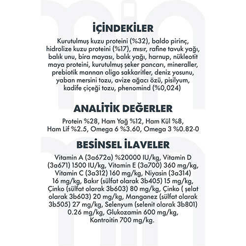 Sindirim dostu baldo pirinç, hidrolize kuzu proteini ve prebiyotik lifler, hassas mideye sahip küçük ırklar için mükemmel bir denge sağlar. İçeriğinde bulunan yaban mersini tozu, deniz yosunu ve kadife çiçeği özü doğal antioksidanlar açısından zengindir; böylece bağışıklık sistemini destekler, cilt ve tüy sağlığını korur.