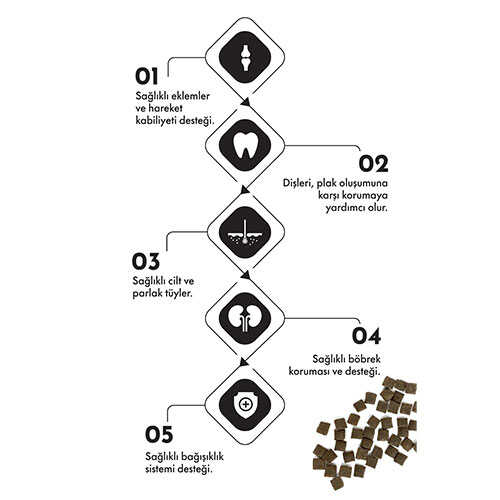 - %19 kuru kuzu proteini ve %8 kurutulmuş kümes hayvanları eti: Kas gelişimini destekler ve sindirimi kolaydır.