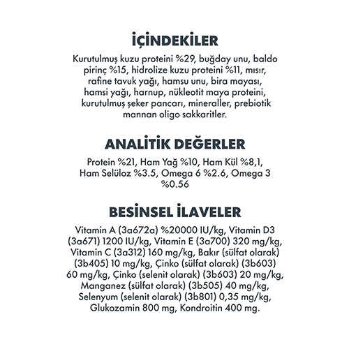Kurutulmuş kuzu proteini (%29), buğday unu, baldo pirinç (%15), hidrolize kuzu proteini (%11), mısır, rafine tavuk yağı, hamsi unu, bira mayası, hamsi yağı, harnup, nükleotit maya proteini, kurutulmuş şeker pancarı, mineraller, prebiotik MOS.
