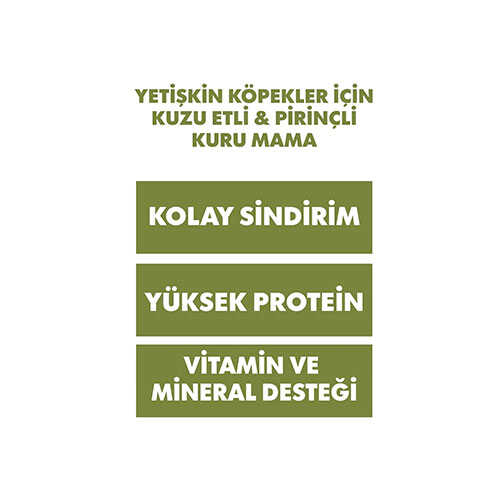 Kuzu eti, köpeklerin severek tükettiği kaliteli bir protein kaynağıdır. Pirinç ise karbonhidrat bakımından zengin olup köpeğinizin gün boyu enerjik kalmasını sağlar. Omega 3 ve Omega 6 yağ asitleri, deri ve tüy sağlığını korurken parlak bir kürk görünümü destekler.
