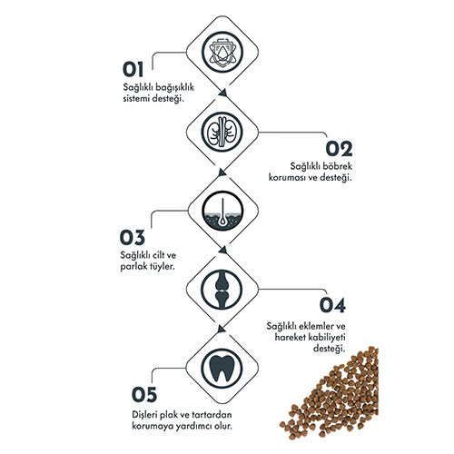 - Omega 3 & Omega 6 dengesi: Sağlıklı deri, parlak tüyler ve güçlü eklemler için gerekli yağ asitlerini sağlar.