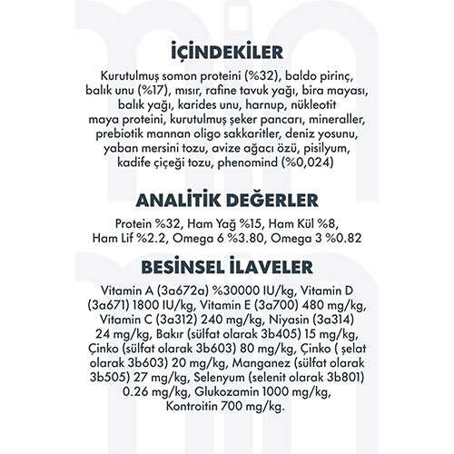 Kurutulmuş somon proteini (%32), baldo pirinç, balık unu (%17), mısır, rafine tavuk yağı, bira mayası, balık yağı, karides unu, harnup, nükleotit maya proteini, kurutulmuş şeker pancarı, mineraller, prebiyotik mannan oligosakkaritler, deniz yosunu, yaban mersini tozu, avize ağacı özü, pisilyum, kadife çiçeği tozu, phenomind (%0,024).