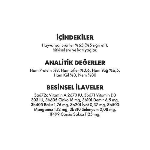 - Yüksek Oranda Hayvansal İçerik: %65 hayvansal ürün ve %5 sığır eti ile kas ve dokuların sağlıklı gelişimini destekler.