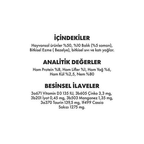 Yüksek kaliteli hayvansal protein (%50) ve somon (%5) içeriğiyle kedinize hem lezzetli hem de besleyici bir öğün sunar.Somonun zengin Omega yağ asitleri, kedinizin tüylerini parlak, derisini sağlıklı tutarken; düşük yağ oranı, ideal kilosunu korumasına yardımcı olur.