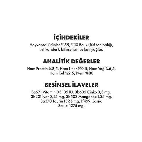 Ton balığı ve karides içeriği sayesinde kedinizin kas yapısı, enerji seviyesi, tüy sağlığı ve sindirim sistemi desteklenir. Günlük öğünlerde dengeli, sağlıklı ve lezzetli bir seçenek sunar.