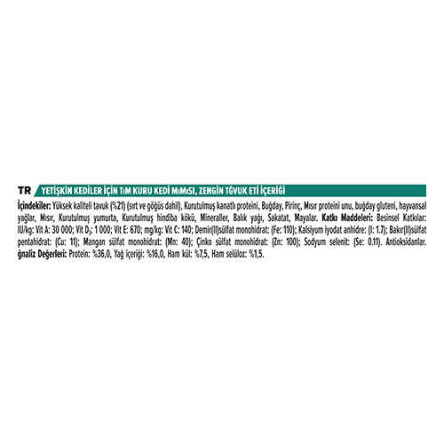 - Yüksek Kaliteli Tavuk Eti: İçeriğinde %18 tavuk eti bulunur, bu da kedinizin yüksek kaliteli protein ihtiyacını karşılar.
