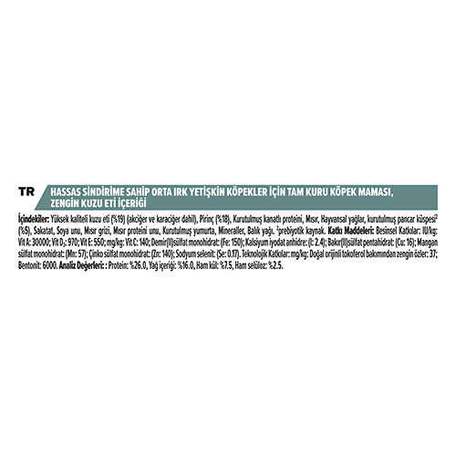 Purina Pro Plan Medium Adult Sensitive Digestion Kuzulu Orta Irk Yetişkin Köpek Maması, hassas sindirim sistemi olan orta ırk yetişkin köpekler için özel olarak formüle edilmiştir. Bu mama, kolay sindirilen kuzu eti ve prebiyotik liflerle, köpeğinizin sindirim sağlığını destekler ve sindirimi kolay bir beslenme sağlar.