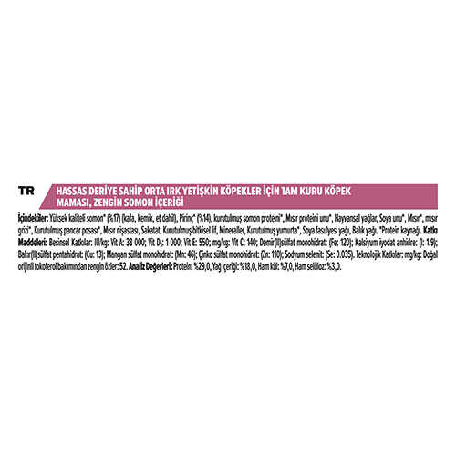 Purina Pro Plan Medium Sensitive Skin Adult Somonlu Orta Irk Yetişkin Köpek Maması, orta ırk yetişkin köpeklerin hassas ciltleri ve sindirim sistemleri için özel olarak formüle edilmiştir. Bu mama, somon gibi kaliteli bir protein kaynağı ile köpeğinizin sağlıklı tüyleri ve cildi için destek sağlar.