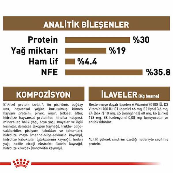 - Ana İçerikler: Bitkisel protein izolatı, ön pişirilmiş buğday unu, kurutulmuş kümes hayvanı proteini, pirinç, mısır, balık yağı, soya yağı.