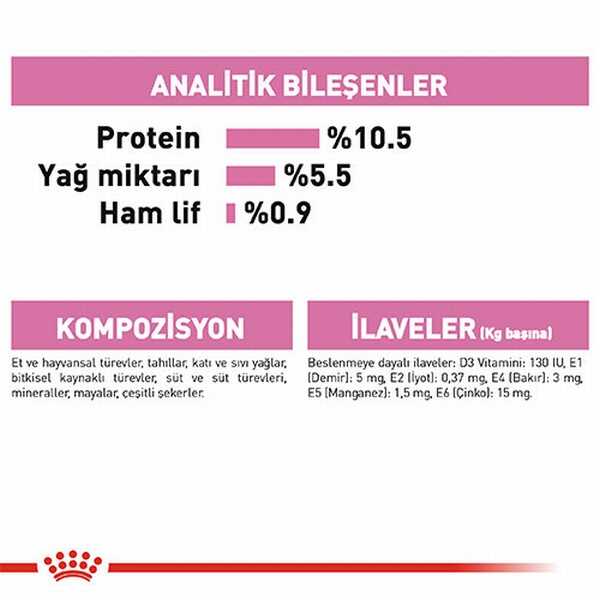 Royal Canin Mother & Babycat Pate Yavru Kedi Konservesi, gebelik ve emzirme dönemindeki anne kediler ile 1-4 aylık yavru kedilerin beslenme ihtiyaçlarını karşılamak için özel olarak formüle edilmiştir. Yavru kediler için ideal başlangıç maması olan bu ürün, ultra yumuşak kıvamı ve besleyici içeriği sayesinde, anne sütünden katı gıdaya geçişi kolaylaştırır ve yavru kedilerin sağlıklı gelişimine katkı sağlar.