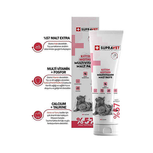 Supravet Kitten Mother Multi Vitamin Malt Paste, yavru kedilerin sağlıklı gelişimini desteklemek ve anne kedilerin doğum sonrası artan besin ihtiyaçlarını karşılamak amacıyla özel olarak formüle edilmiş çok yönlü bir takviye macunudur. Vitamin, mineral ve malt içeriği sayesinde hem bağışıklık sistemini destekler hem de sindirim sağlığının korunmasına yardımcı olur.