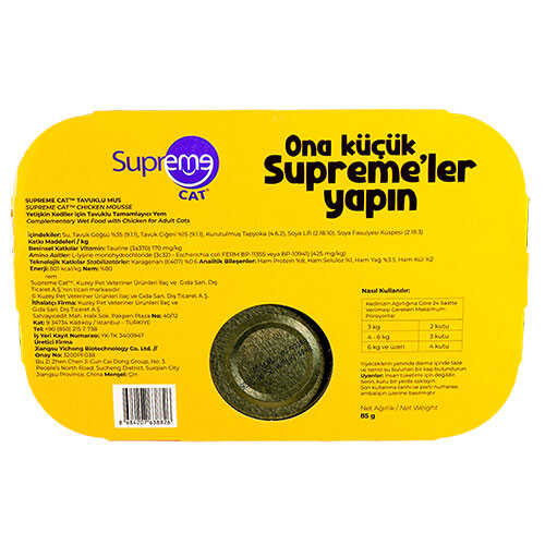 Supreme Cat Mousse Tavuklu Yetişkin Kedi Konservesi, yetişkin kedilerin günlük beslenmesine katkı sağlayan, yüksek et oranına sahip, yumuşak mousse kıvamında premium bir yaş mama seçeneğidir. %35 oranında tavuk göğsü ve %15 tavuk ciğeri içeriğiyle kedinizin damak tadına hitap ederken, doğal yapısıyla hassas mideli kediler için de ideal bir tamamlayıcı mama sunar.