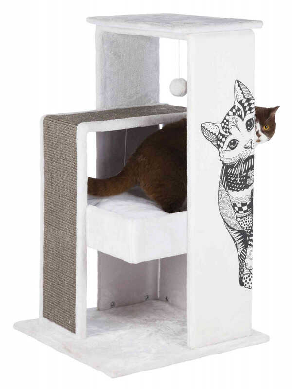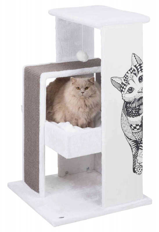 Trixie Kedi Tırmalama ve Oyun Evi 101cm Beyaz GriModern tasarımlı, yatak ve platform kenarları süet görünümlü, içleri peluş, bir bölümü tamamen doğal sisal kaplama tırmalama alanı olan kedi tırmalama ve oyun evidir. Yatak bölümü çift taraflıdır ve elde yıkanabilir. Taban alanı 58x58cm yükseliği 101cm dir. Gri ve beyaz renklidir. Üzerinde çok güzel ve modern kedi figürü bulunmaktadır.